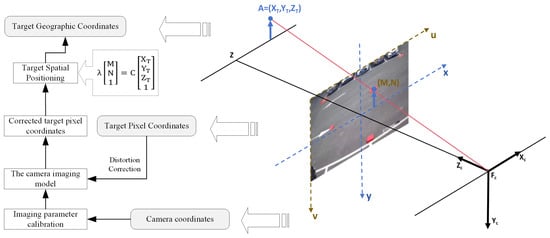 The geospatial positioning of video-detected tourist targets represents the final step in accurately capturing the spatiotemporal information of tourists in mountainous scenic areas using distributed cameras. This process is underpinned by the BeiDou unified time–space reference, as illustrated in Figure 4. Initially, the cameras within the scenic area are calibrated to ascertain their intrinsic and extrinsic parameters, thereby establishing the camera’s imaging model. Utilizing this model, the pixel coordinates of detected targets undergo distortion correction, which ensures an accurate representation of the scene’s actual shape, size, and position while mitigating distortion effects. Ultimately, the corrected pixel coordinates are transformed into geographic coordinates. This integrated approach facilitates the precise localization of detected targets within the real world, significantly enhancing the applicability and utility of the detection technology. It also supports extended applications in safety monitoring, incident response, and spatial analysis.