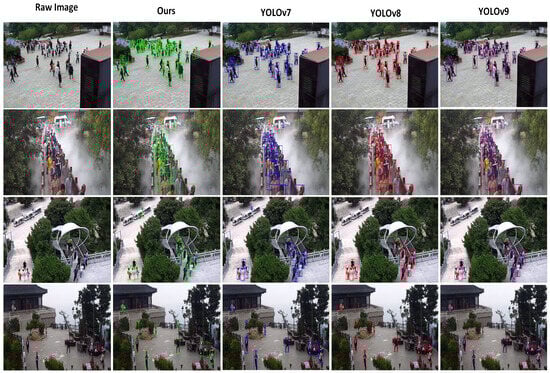 To further verify the accuracy of the algorithm, we compared it with three recent algorithms in the YOLO series: YOLOv7, YOLOv8, and YOLOv9. As shown in Figure 6, the detection results indicate that our algorithm outperforms these alternatives in handling occlusions and detecting objects at greater distances from the camera. Quantitative comparisons are presented in Table 3. Additionally, we conducted quantitative evaluations of the algorithm’s applicability across different scenarios, overall precision, and performance metrics, with the results summarized in Table 4. The detection accuracy for the test samples across four designated areas is approximately 90%, with an average frames per second (FPS) of 25.35 and a mean AP0.5 of 0.8705. The experimental results indicate that the algorithm meets the requirements for precise tourist detection in scenic areas, performing well in scenarios involving small, distant objects and high-density crowds. Overall, the algorithm demonstrates strong accuracy and recall rates.