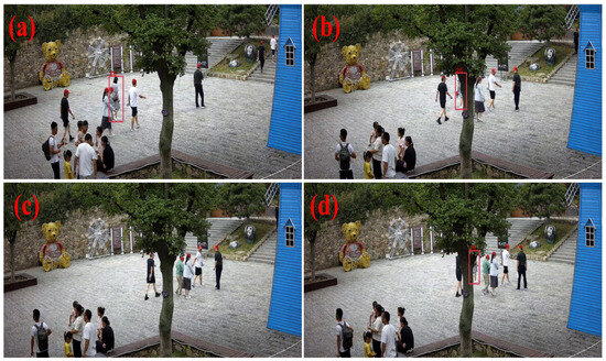 Accurate recognition of spatiotemporal information of scenic spot tourists based on near-field quasi-real-time perception system. The boxes in the figure are the detection result boxes, and (a–d) represent four different moments.