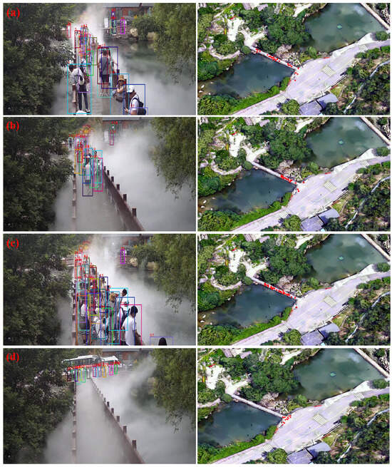 The results of continuous and accurate dynamic monitoring of tourist information based on the proposed near-field quasi-real-time perception system are shown in Figure 8. On the left side of Figure 8, the results of detection, tracking, and positioning by cameras are displayed, while the right side shows the real-time representation of tourist spatiotemporal dynamic information as red dots on a digital map. Figure 8a illustrates the distribution of people around the Xiaodiao Museum bridge at 2:45 PM on 15 July 2024; Figure 8b shows the distribution at 2:46 PM; Figure 8c shows it at 2:47 PM; and Figure 8d shows the distribution at 2:48 PM. The pixel coordinate positions of the target detection boxes, obtained from the distributed camera detection and tracking, are sent to the tourist target geospatial positioning module and converted into geographical coordinates under the BeiDou unified space–time framework. This information can be directly applied to the dynamic management of tourists in complex mountainous scenic areas and related service applications.