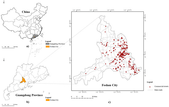 Study area. (a) Location of Guangdong Province in China. (b) Location of Foshan City in Guangdong Province. (c) Distribution of commercial streets in Foshan.