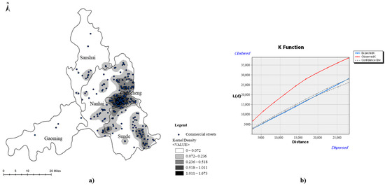 (a) Distribution of commercial streets in Foshan. (b) Analyze the K function of commercial streets.