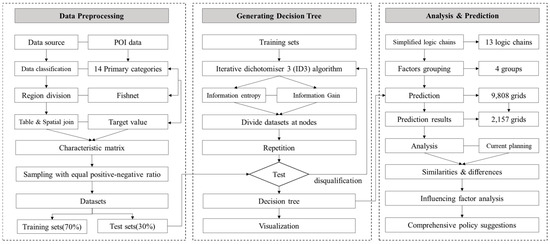 Drawing upon existing research [34], this study constructs a commercial street site selection prediction model using POI big data and decision tree algorithms. The ID3 (Iterative Dichotomiser 3) algorithm, proposed by Quinlan in 1986 [35], is employed for model training. ID3 uses information entropy and information gain as splitting criteria and recursively selects the optimal attributes to construct a classification tree [13,30,36].