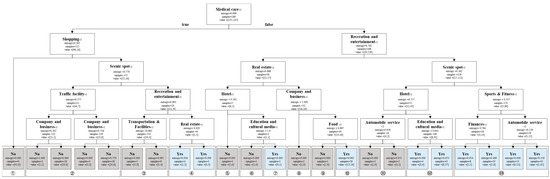On the second level of the decision tree, “Shopping” and “Recreation & entertainment” emerge as the next best bases for location selection when Medical Care POIs are absent or present, respectively. The presence of shopping venues and recreation and entertainment facilities not only corroborates the population size of the surrounding area but also provides retail business support and agglomeration effects for the construction of commercial streets.