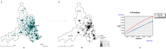 (a) Distribution of POI locations in the “Medical Care” category. (b) Kernel density analysis of POIs in the “Medical Care” category. (c) K function analysis of POIs in the “Medical Care” category.