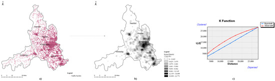 (a) Distribution of POI locations in the “Traffic Facility” category. (b) Kernel density analysis of POIs in the “Traffic Facility” category. (c) K function analysis of POIs in the “Traffic Facility” category.