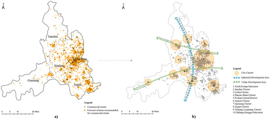 (a) Prediction results of location selection for commercial streets. (b) Comparison between the predicted site selection results of commercial streets and the current planning.