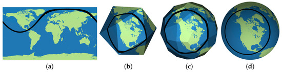 DGGSs can be constructed directly in the target spatial domain (such as the sphere or ellipsoid) or by using a proxy domain (such as a polyhedron). Adapting existing geometric modelling or computational geometry techniques from their Euclidean domain to a spherical or ellipsoidal domain is a challenging task [3,5]. Thus, providing an efficient polyhedral domain in which operations can be defined efficiently is an important area of research. DGGSs constructed directly in WGS84 coordinate space have longitude and latitude lines as cell boundaries [27]. Quadtrees are a typical example and are often used for mapping software [28,29,30]. These DGGSs have a simple implementation, can easily match their resolution to common satellite sensor sizes [27], and have visualization familiarity and efficiency, but the cells at a given resolution vary widely in shape and size, making them less suitable for many operations. DGGSs constructed directly in spherical or ellipsoidal space [31,32] require nonlinear recursive refinement and are much less efficient at high resolutions, especially when equal-area cells are desired. DGGSs usually use a polyhedral proxy, which allows for efficient planar refinement and indexing but requires a mapping between the proxy and spatial domain, which introduces distortion [33]. In this paper, we show how to create polyhedral DGGSs with low distortion, increased uniformity, and efficient operations.