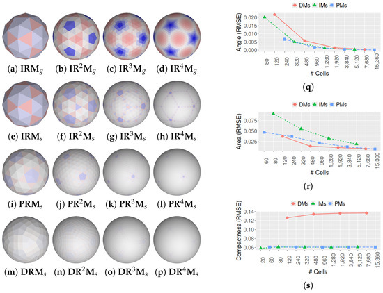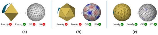 Most of these polyhedra have symmetries which are used to implement highly efficient point-to-cell operations, but they all poorly approximate the sphere and have high distortion (Figure 2). The disdyakis triacontahedron more closely approximates the sphere, and has less distortion than these polyhedra [33]. However, the distortion is enough that an equal-area projection is used, which results in an expensive projection, increased angular distortion, and nongeodesic cell edges. As observed in these works, changing the base polyhedron requires redefining and designing other components of the DGGS [33,37,38,44]. As a result, these works are limited to a single polyhedron and are only available for the Platonic, Archimedean, and Catalan solids. MBD enables using any triangle mesh, including high-resolution meshes, which can reduce the distortion to very low levels. Additionally, MBD allows the use of a broader range of polyhedra without the need to redevelop other components of the DGGS.