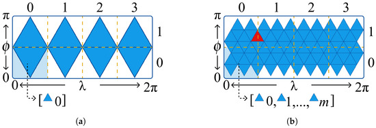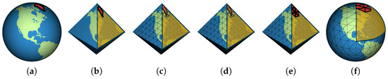 We use a geometric approach of a piecewise gnomonic projection. Projection and inverse projection are defined between the base polyhedron’s planar triangles and the spherical triangle counterpart. Projection from the spherical triangle to the planar face is determined by constructing a ray emanating from the point on the spherical domain towards the origin. This ray is intersected with the polyhedral face using the well-known ray–plane intersection. Let be the normal to the polyhedral face. Let be a point on the face, for example, one of the vertices of the polyhedral face. Let be the point we wish to project, which is assumed to be a unit vector. The projected point is found by scaling by which is calculated as follows: [53]. Inverse projection is a direct inversion of this scaling. For a unit sphere, this is equivalent to normalizing the point (), which is a highly efficient operation.