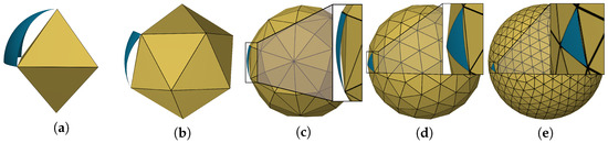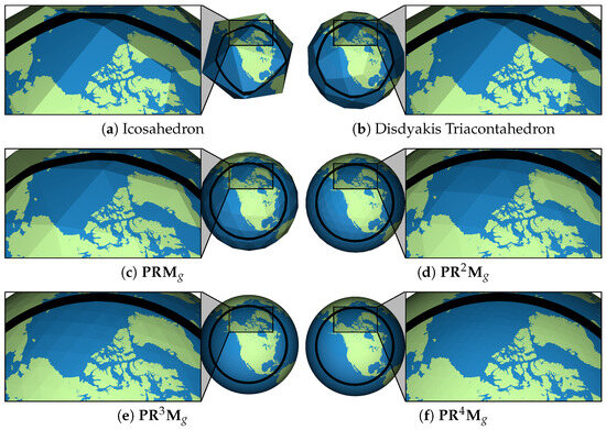 The base polyhedron impacts cell shape, total distortion, and efficiency of operations. Many base polyhedrons have been used throughout the literature. The cube [37] and hexahedron [38] have quadrilateral faces, efficient row–column-based indexing, and a low-aperture refinement. The octahedron [32,39] can be used with triangle cells or as a truncated octahedron, which allows for mostly hexagonal cells. The icosahedron [40,41,42] can also be used directly with triangle cells or as a truncated icosahedron with mostly hexagonal cells. The stellated dodecahedron [43], the rhombic dodecahedron [44], and the rhombic triacontahedron [45] have also been used.