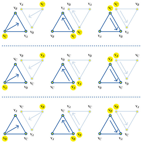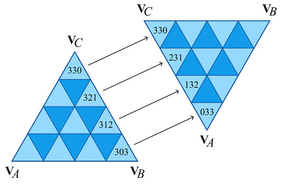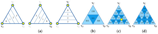 Assuming that a triangle is formed from three points , , and , any point within the interior of this triangle can be expressed by three coordinates, , , and , where and . This is equivalent to a 3D coordinate domain with three basis vectors and is called the normalized barycentric coordinates of a triangle. These coordinates naturally emit an indexing scheme [13,32]. To use these as integer cell indices, first notice that there are rows in each basis direction at resolution w (Figure 7a), then scale each of the coordinates by r and round down. This will result in a unique set of indices for each cell (Figure 7a,b). However, the function is not onto: some coordinates are syntactically valid indices, such as 113, but do not represent a cell. This is due to using three basis vectors to represent a 2D domain. Normalized barycentric coordinates are uniquely determined by only two of the three coordinates because the third can be found via , resulting in a 2D coordinate system. However, this uniqueness within the coordinate system does not directly transfer to the indices (Figure 7c). Modifications to this scheme to create an onto function are possible but will result in an asymmetric indexing scheme, further complicating indexing operations. Using all three of the coordinates as an index results in symmetry with respect to all three triangle edges and can be efficiently parallelized on modern CPUs through vectorized operations. We use a vectorized implementation of this symmetric 3D barycentric indexing method (BIM). Each index has a triplet of values where each value represents the number of steps away from the associated base-cell vertex (Figure 7a). The resulting indices in resolutions 1 and 2 are shown in Figure 7a,b. At resolution 1, the middle triangle is 1 step away from all of the base-cell vertices and has an index of 111, while the other three are 1 step away from two vertices and 0 steps away from one vertex, resulting in indices of 011, 101, and 110, respectively. The pattern continues for finer resolutions. The final representation for an index is a struct combining all five components: .