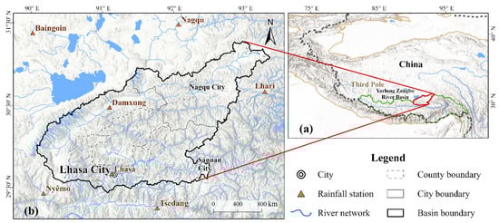 Geographical location and outline of the Lhasa River basin: (a) location of the Tibetan Plateau and Yarlung Tsangpo River basin and (b) distribution of river networks and meteorologic stations.