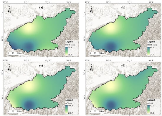 Distribution of four disaster-causing indicators of flash flood hazards in the Lhasa River basin: (a) M3HP; (b) M1DP; (c) AP; and (d) AD.