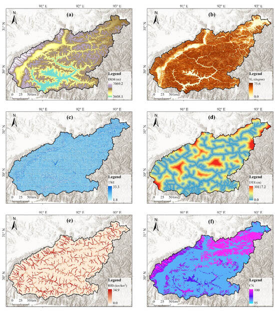 Distribution of the six indicator-inducing environments of flash flood hazards in the Lhasa River basin: (a) DEM; (b) SL; (c) TWI; (d) DTR; (e) RID; and (f) CN.
