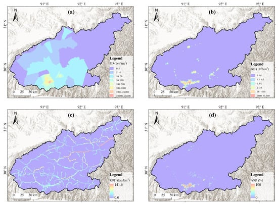 Distribution of four indicators of flash flood exposure in the Lhasa River basin: (a) PD; (b) GD; (c) ROD; and (d) ASD.