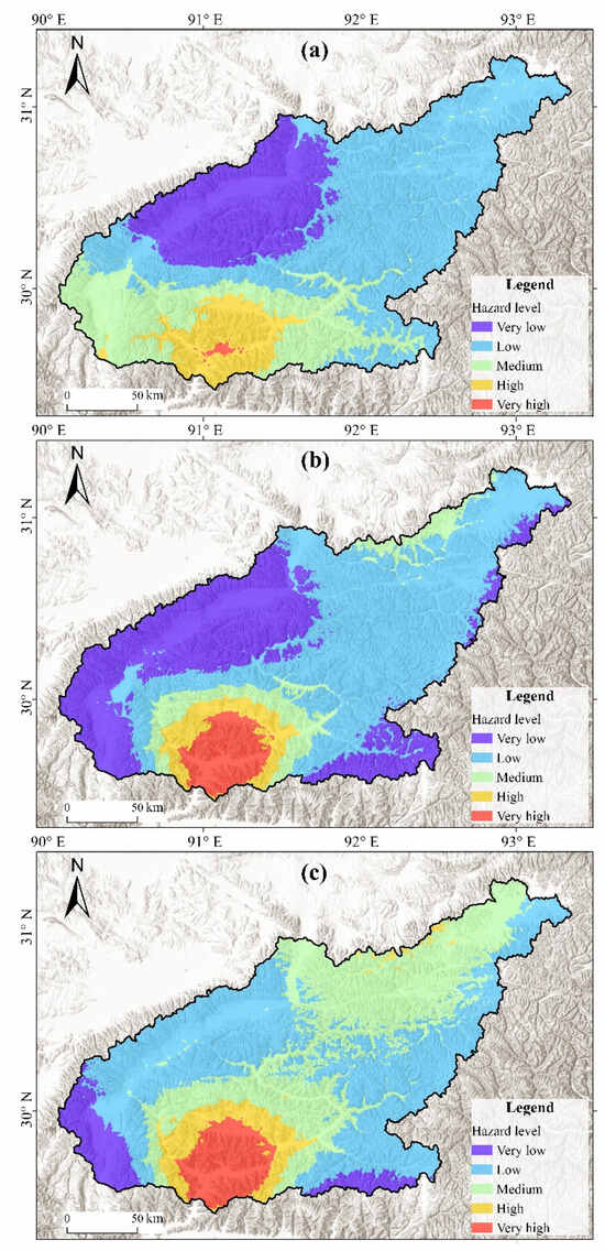 Figure 5 shows the spatio-temporal distribution of flash flood hazards in the Lhasa River basin from 1991 to 2020. The areas classified as having very high and high flash flood hazard levels evaluated using the AHP–entropy combined method were 9.1% (2926 km2), 11.2% (3606 km2), and 13.7% (4389 km2) in 1991–2000, 2001–2010, and 2011–2020, respectively (Figure 5). The area with very high flash flood hazard levels was significantly higher in 2001–2010 and 2011–2020 than in 1991–2000. At lower latitudes (below 30° N), including parts of Chengguan, Qushui, Duilongdeqing, Lhünzhub, and Dagzê counties, the hazard level was very high near the outlet in the downstream basin due to the spatial distribution of M3HP, M1DP, AP, and AD.