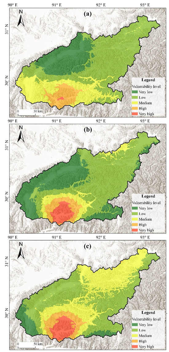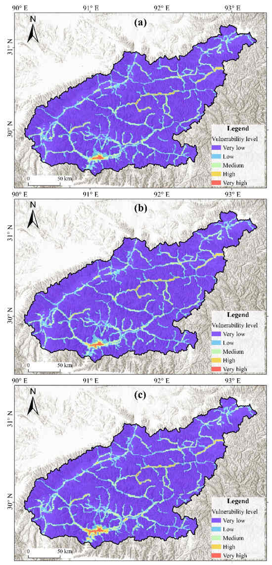 Figure 6 shows the temporal and spatial changes in the vulnerability map of flash floods since the 1990s during rainy seasons. High-vulnerability areas were mainly distributed along the main road network and downstream of the basin around Lhasa city. Furthermore, the general temporal variation in very-high- and high-vulnerability areas was similar to the hazard assessment, as shown in Figure 6. The area rate of high to very high-vulnerability increased by 0.10% (33 km2) in 2001–2010 and 0.36% (115 km2) in 2011–2020, relative to 1991–2000. Very high- and high-vulnerability areas in the Lhasa River basin are mainly located in and around Chengguan county, where population density and local revenue are high.