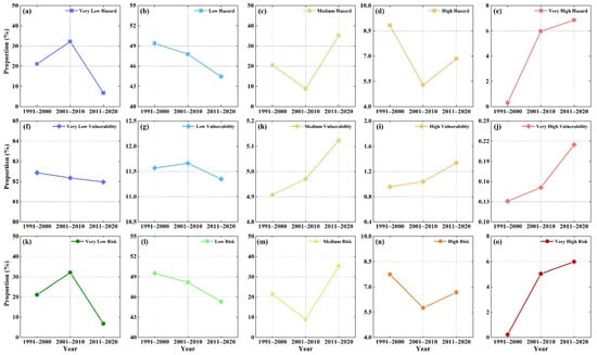 Area proportion variations in (a–e) hazard, (f–j) vulnerability, and risk (k–o) levels of flash floods in the Lhasa River basin during 1991–2000, 2001–2010, and 2011–2020.