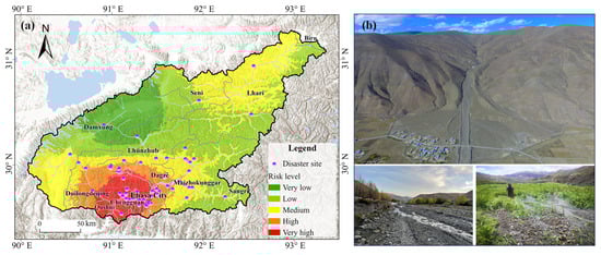 Spatial distribution of flash flood risk in the Lhasa River basin from 1991 to 2020 (a) and investigation sites of flash flood disasters (b).