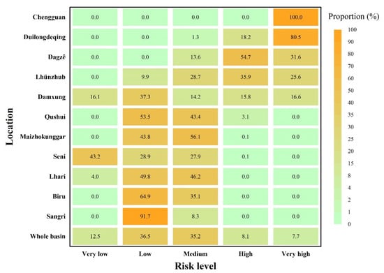 The evaluated distribution of very high flash flood risk in the Lhasa River basin was consistent with the locations of historical flood disaster sites (Figure 9). These results indicate that the mapping method developed in this study is suitable for application in the prevention and mitigation of rainfall-driven flood disasters. On a county scale, all of Chengguan, approximately 98.7% of Qushui, and 86.4% of Dagzê are at high or very high risk of flash flooding (Figure 10), while more than 30% of Duilongdeqing and Lhünzhub are at high risk. In these counties with higher risk, severe flash flood hazards in urban centers may be compounded by the valley topography and human activity. Sustainable prevention measures are therefore recommended for Chengguan and surrounding counties, along with optimized quick response strategies for settlements about emergency flood management [,].