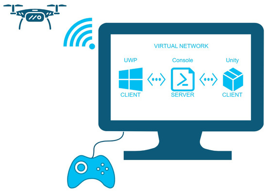 Similarly, the Unity application encompasses three modules or classes: (i) TCPClient, tasked with receiving data extracted from the UAV through the UWP interface and transmitting commands to the UWP application; (ii) DroneData, responsible for updating data within the Unity interface based on information received from the TCPClient module; and (iii) MapBox [79], an SDK employed to generate a MiniMap displaying the UAV’s position by converting the UAV’s latitude and longitude coordinates into corresponding x and y coordinates.