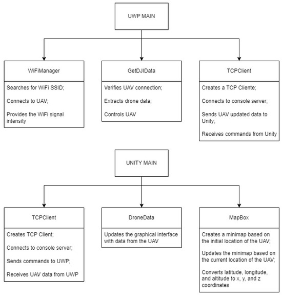 The system comprises distinct modules or classes distributed across the constituent applications (Figure 4). Within the UWP application, three primary modules are present: (i) WiFiManager, responsible for managing the WiFi connection between the computer and the UAV; (ii) GetDJIData, which acquires sensor data and transmits commands to the UAV; and (iii) TCPClient, enabling seamless communication with the Unity application.
