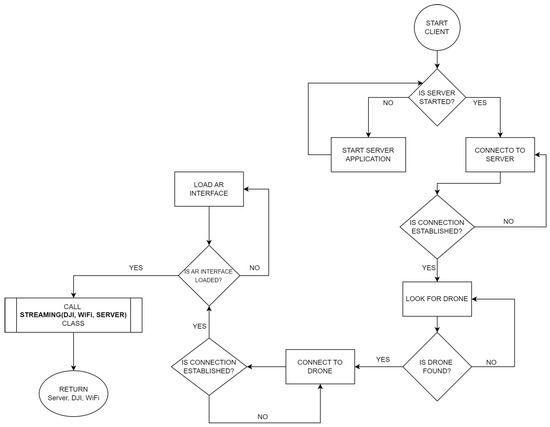 To initiate the DJI Client application, an initialization algorithm for services was devised. Each service must be initiated in a specific order to ensure proper system functionality. The initiation algorithm (Figure 5) first checks if the server (console) is running and, if not, starts it automatically. It then attempts to establish a connection to the server. Only after a successful connection is established, it searches for the UAV’s network and establishes a connection with it. Subsequently, it executes the Unity developed graphical interface. To complete the system initialization, the application invokes the Streaming(Server, DJI, WiFi) class, transmitting data to the AR graphical interface.