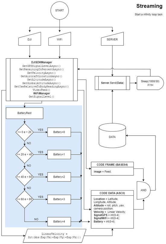 Establishing a connection with the UAV required creating a class called WiFiManager(). This class encompasses functions for searching WiFi adapters on the computer, listing accessible networks, selecting the UAV’s SSID, and establishing a connection, resulting in a “UAV Network” object. The Streaming class inherits objects from the application, including DJI, WiFi, and the server (Figure 6). The DJI object facilitates the connection with the UAV and allows the request of various data, such as the GPS signal, battery percentage, velocity, location, altitude, attitude (rotation), camera gimbal rotation in relation to the UAV’s body, and camera image. Although the UASs did not provide raw IMU data, the data obtained from both the UAV and the camera gimbal (such as altitude, attitude, and speed) were incorporated into the interface through the API. The WiFi object provides information about the WiFi signal quality. Before sending data to the server, two pieces of information require processing: the velocity, reported across three axes (x, y, z), needs to be transformed into linear velocity by calculating the diagonal of the axes (Equation (1)), while the remaining battery, expressed as a percentage, must be converted into integer values from 0 to 4 using a Switch Case logical function, as graphical icons represent the remaining battery level. Finally, all the data need to be encoded before being sent to the server. This process is repeated 30 times per second, as it allows for smooth visualization without overloading the Wi-Fi communication between the computer and the UAV.