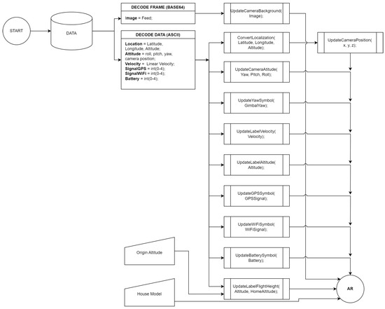 The UpdateScene() class in the Unity Client receives data sent by the server and decodes it, separating it into variables. It then executes various functions, including updating the scene’s background image with an updated frame, converting GPS location into units (x, y, z) to reposition the camera in the 3D environment, updating camera rotation based on UAV attitude data, updating graphical indicators for battery level, GPS signal strength, WiFi signal strength, UAV linear velocity, altitude, flight height, and updating the symbol indicating the camera gimbal angle in relation to the UAV’s body. All the graphical interface data created in Unity are updated in real time with each received frame, resulting in the AR experience of the application (Figure 7).