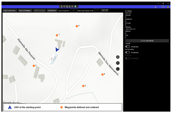 The intent was to conduct a flight over the terrain to enable the visualization of the building model from various perspectives. Therefore, a new class named “WaypointMap” was developed to create a flight mission based on georeferenced points plotted on a map. This class, denoted as “WaypointMap”, retrieves georeferenced points from a map and defines the maximum speed and flight height (Figure 8).