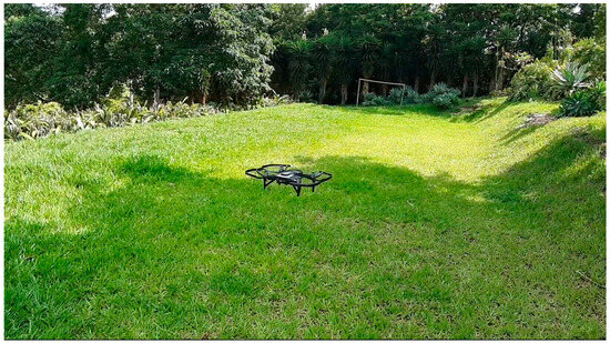 The system test was conducted in favorable weather conditions, specifically on a grassy terrain with no winds or rain. The UAV was positioned over the lawn at the designated takeoff location (Figure 9) to commence the flight mission. As a precautionary measure to prevent the propellers from making contact with the grass, leg extensions were affixed to the UAV. To evaluate the system, a model based on the Wrocław House [80] was used. This model was used because it relates to an architectural project, and its dimensions fit within the selected terrain.