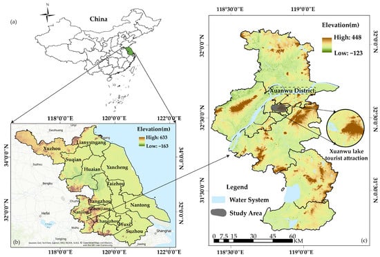 Location of Xuanwu Lake tourist attraction: (a) the location of Jiangsu province in China; (b) the location of Nanjing in Jiangsu Province; (c) the location of Xuanwu Lake tourist attraction in Nanjing.