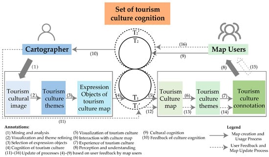 - Cognition and map visualization: The expression objects are then (4) cognitively understood by the cartographer, leading to (5) the visualization of these objects on the map. The map is then interacted with by map users who (7) experience the tourism culture and (8) perceive and understand the cultural connotations on the map. This completes the initial cycle where (9) the cultural cognition is gathered from users’ interactions with the map.