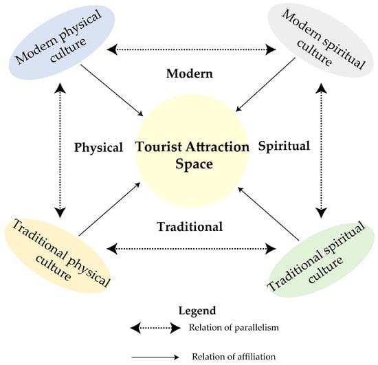 There are differences in the understanding of culture in different schools of thought, and a unified definition has not yet been formed. As far as the tourist attraction space is concerned, due to the intertwined existence of “physical-spiritual” and “traditional-modern”, culture has been deconstructed into four dimensions, with traditional culture being the culture of historical architecture, religious beliefs, and other cultures inherited from the tourist attraction area through the accumulation of historical development and modern culture being the advanced culture of science and technology, civilization norms, and other advanced cultures produced in response to the development of the times. While traditional culture contains physical and spiritual aspects, modern culture also covers these two dimensions, which are cross-connected and interpenetrated. The cultural composition of the scenic space is shown in Figure 3.