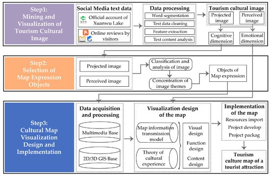 The procedure for realizing the tourism culture map is shown in Figure 5. The procedure is divided into three parts: mining and visualization of tourism cultural image, map expression objects selection, and tourism culture map visualization design and implementation.