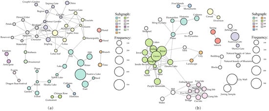 High-frequency word co-occurrence network of the cognitive dimension of tourism cultural image in Xuanwu Lake tourist attraction: (a) the result of the official dimension; (b) the result of the tourist dimension.