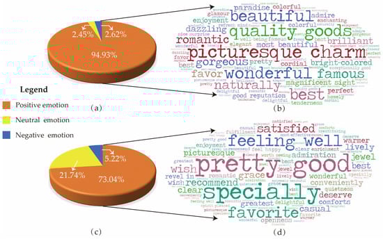 The analysis and visualization of the emotional dimension focus on revealing the official attempts to convey the emotions of the tourism destination or the impressions and perceived attitudes of tourists towards the destination by analyzing the sentiment, nouns, and adjectives used in the text. Standard methods for emotional visualization include basic charts, river charts, heat maps, cloud maps, and radar charts. Among them, basic charts mainly show the distribution of emotional intensity through bar charts, pie charts, area charts, etc. [,,]; river charts mainly show the changes in emotions over time []; heat maps can reveal the differences in data, which helps to differentiate between different types of emotions []; cloud charts can visualize keywords that appear more frequently in the text, which is suitable for understanding the core emotions []; and radar charts have a clear advantage in expressing multidimensional features in emotions []. Considering the analysis tools of this study and the aim of revealing the central emotional attitudes of tourism destination officials and tourists in the text, we chose pie charts to indicate the percentage of emotions and cloud diagrams to reflect the core emotions.