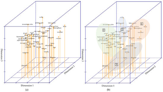 Refining cultural image themes from tourists’ cultural image of cognitive dimension: (a) the result of multidimensional scale analysis; (b) the classification result of tourism cultural image based on the proximity of the words and the cultural connotations they denote. The “1–4” represents the four categories according to the remoteness of the words and their cultural meanings. “1” represents the perception of architectural culture related to the Xuanwu lake; “2” represents the perception of topography and geomorphology culture related to the Xuanwu lake; “3” represents natural vegetation landscape culture related to Xuanwu lake; “4” represents the water culture related to Xuanwu lake.