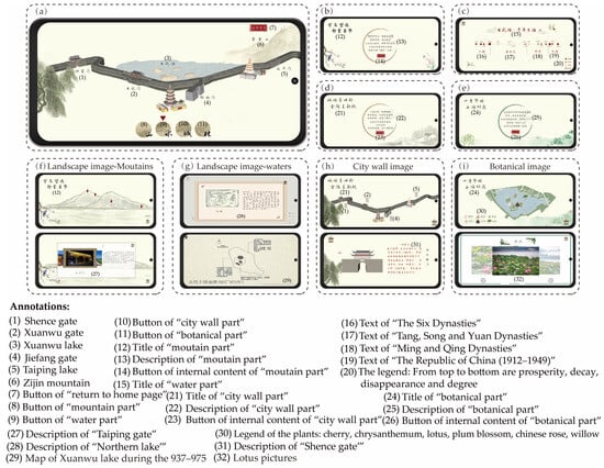 Tourism cultural map development case: (a) the primary interface for map interaction; (b–e) interactive entrances corresponding to the four cultural themes of the Xuanwu Lake tourist attraction; (f–i) map contents for further cultural experiences for themes (b–e), respectively.