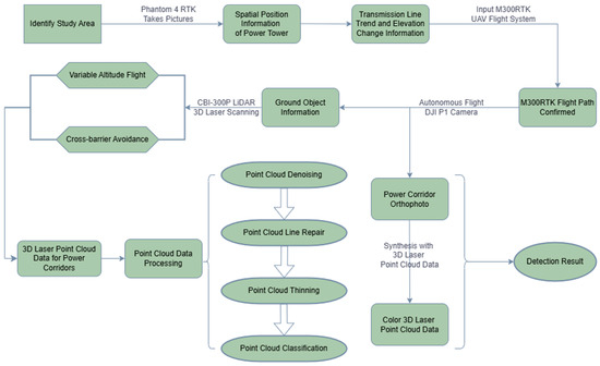 The methodology adopted in this paper is mainly in two parts: data acquisition and data processing. The data acquisition includes transmission line information acquisition, UAV variable-height flight, and cross-barrier avoidance, and the data processing includes point cloud denoising, point cloud line repair, point cloud thinning, and point cloud classification, as shown in Figure 1.