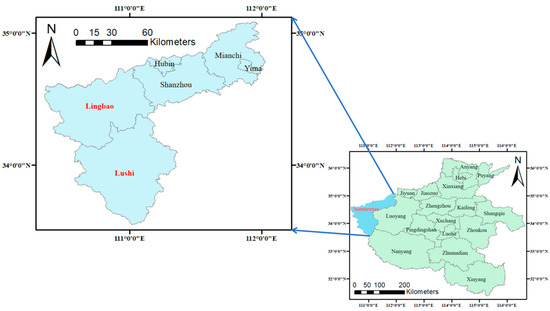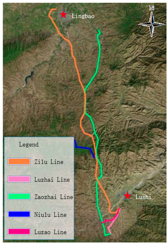 The study area is located in Lingbao City and Lushi County, Sanmenxia City, Henan Province (refer to Figure 2). The distance from Lingbao to Lushi is about 52 km, with 5 transmission lines totaling approximately 160 km (refer to Figure 3). The topography of the study area is complex, characterized by low terrain on both sides and higher elevations in the middle. The terrain exhibits significant undulation, with elevations ranging from about 600 m to about 1300 m, as displayed in Figure 4. In this paper, we employ airborne 3D laser scanning technology to detect safety hazards along the power corridors. This approach effectively addresses the challenges of technical complexity, labor intensity, and low productivity associated with manual inspection methods for transmission lines in mountainous terrain with complex geological conditions, enabling routine inspection and maintenance as well as the identification of safety hazards.