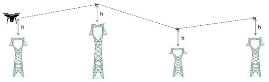 The height of the power tower in the plain area is basically the same, and there is almost no fluctuation in the transmission line. However, the power tower and its transmission line in the mountainous area are affected by the complex geological conditions in the mountainous area, and there are realistic situations such as large height fluctuation and large elevation span. Therefore, the variable-height flight method (Figure 6 and Figure 7) can be more suitable for the detection of the hazards of transmission lines in mountainous areas.