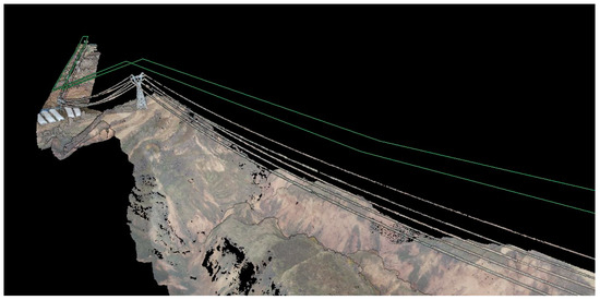 In the absence of wind, overhead transmission lines are influenced by gravity, causing the power line to adopt a catenary shape in the middle of the power towers. This catenary shape can be modeled accurately and quickly by solving the catenary model parameters from the corresponding point cloud data to model the power line remnant part [26]. For a roughly extracted power line point cloud, the catenary Equation (5) [27] can be solved to construct a power line model, as highlighted in Figure 13.