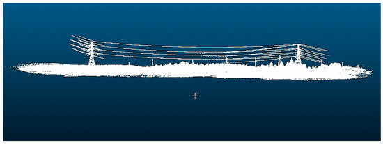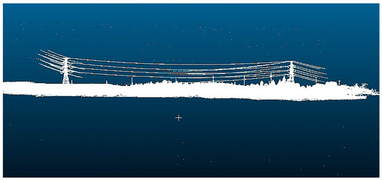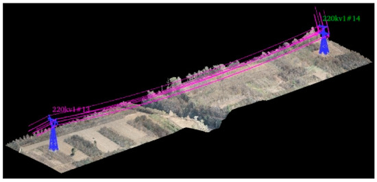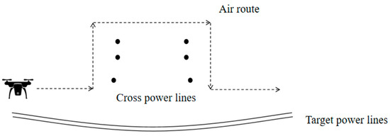 In the power corridor, there are transmission line crossings [19], as shown in Figure 8. By employing the “6 points crossing method”, the DJI M300RTK UAV can safely pass the crossing according to the planned flight path under the premise that the transmission line trend and elevation change information have been input into the flight system of DJI M300RTK UAV, which can reduce the impact on the scanning effectiveness of the target power lines at the crossings and ensure the integrity of the point cloud data at these locations.