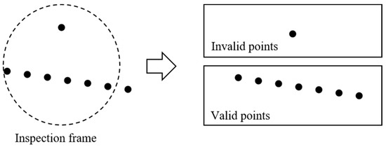 Finally, the range of is determined by Equation (4), where target points within the range of are retained as valid points; otherwise, they are considered noise points for removal.