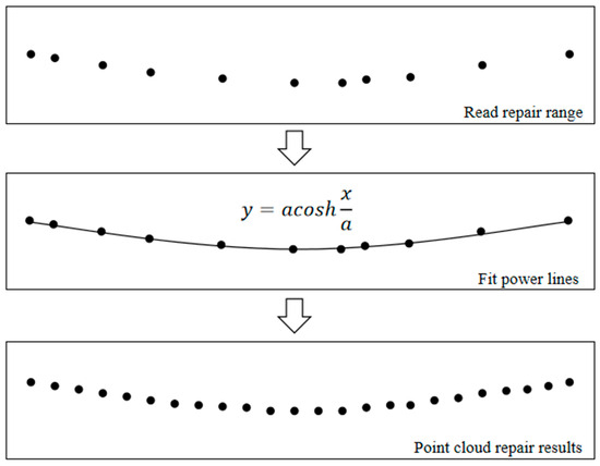There are two cases of missing point clouds of overhead transmission lines: partial missing and complete missing. In the case of partial missing point clouds, a catenary can be fitted according to the existing partial point cloud data, and the missing point cloud data of power transmission lines can be repaired according to the shape of the catenary. When the overhead transmission line point cloud is completely missing, the catenary equation can be directly constructed according to the connection points at both ends and the catenary coefficient, and then, the missing power transmission line point cloud data can be repaired.