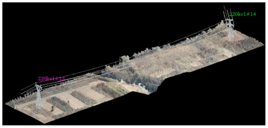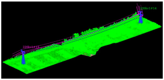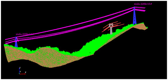 Before classifying the point cloud data of the power corridor, it is necessary to mark the types and locations of the power towers and delineate the coverage of the power towers. The overall power corridor point cloud data, including the two power towers and the transmission line in the middle, can be segmented into units for the classification of point cloud data in each file, and can reduce the overall point cloud classification of the amount of calculation. Using ground laser point cloud processing software Tovos, the power corridor point cloud data can be initially divided into four categories: power towers, transmission lines, vegetation, and ground, as depicted in Figure 15.