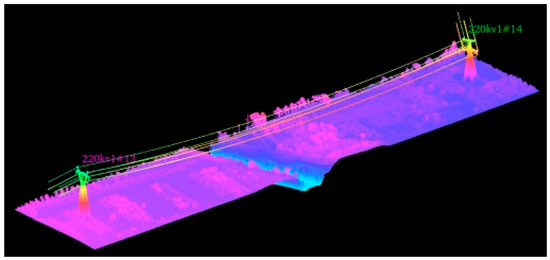 After repairing the power line point cloud data, combined with the orthophoto of the power corridor, the point cloud data of the power corridor are colored by the DJI Wisdom Map software, and the color point cloud data are generated, as shown in Figure 14. The color point cloud data provide a wealth of visual information, making the power corridor data more real and vivid; can better distinguish power lines, vegetation, and other ground objects; and can improve the accuracy of ground object identification, so as to better carry out point cloud classification operations and analyze power corridor safety hazards.