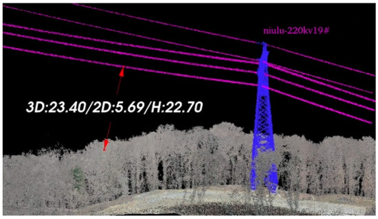 2. Through point cloud denoising, line repair, thinning, and classification, the processing of 3D laser point cloud data of the power corridor was achieved. Based on the calculation of power towers, transmission lines, and other surface features of the clearance, horizontal, and vertical distances, we combined our results with the requirements of the safety distance to obtain information on potential hazards.